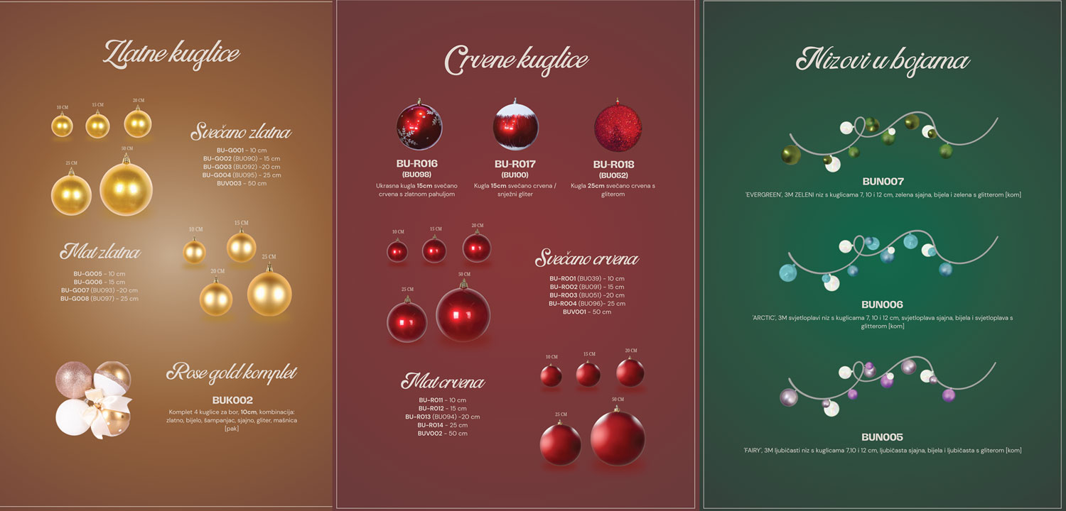 Katalogom je predstavljen dio naših dizajna i modeli ukrasa koje mi izrađujemo, naši LED, COB nizovi za dekoracije stabala i velikih borova, božićni dekori razni... . Pogledajte naš PDF katalog. Za sve informacije stojimo vam na raspolaganju.